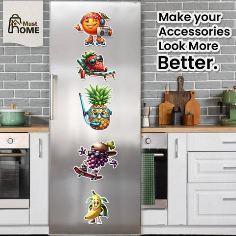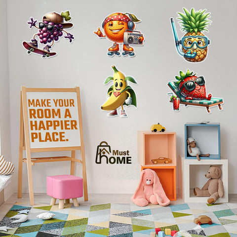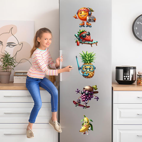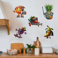 PLAYFUL DESIGN: Set of 5 vibrant fruit character wall stickers featuring whimsical cartoon fruits with fun accessories - perfect for adding personality to kitchen spaces